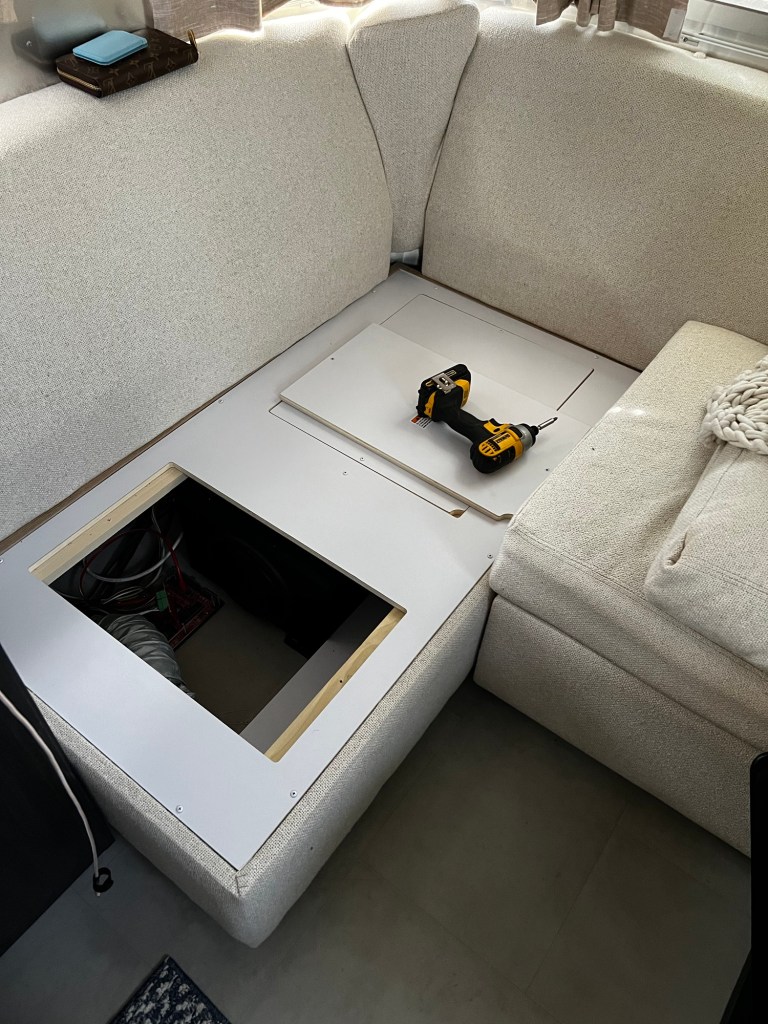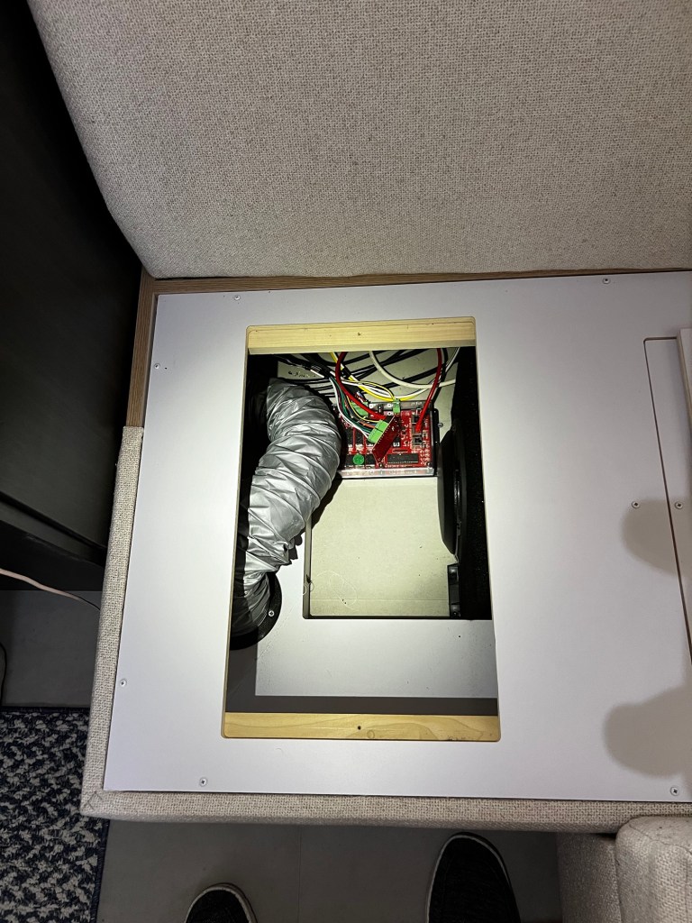 This is one thing that irritates me about Airstream’s manuals: they don’t show a layout of the trailer and locations of equipment behind the numerous panels and cushions throughout the coach. Nevertheless, I ended the call with Zip Dee and called Airstream Support. The Airstream technician referred me to “under the rear dinnette bench,” where I found the second 12-volt fuse panel under the panel within the 12″ by 12″ plywood covered hole under the rear cushion.