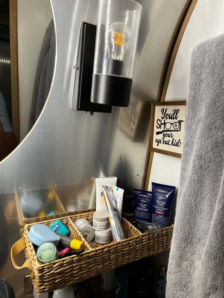The existing shelf at this spot seemed useless, so I placed this woven rectangular basket (<– get it here, #ad) on the shelf and hooked it in place with Command Strip hooks (<– get it here, #ad), placed up-side-down on the wall hooked onto the top lip of the basket to hold it against the wall and down into the existing metal shelf.