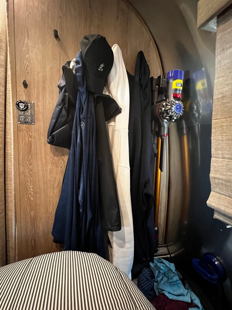 The only thing we have actually screwed into the wall, the Dyson V8 Cordless Vacuum (#ad) is installed in this convenient location allowed for storing all the most used parts (crevice tool, brush tool, and floor beater bar with long tube). Just plug it into the nearby outlet.